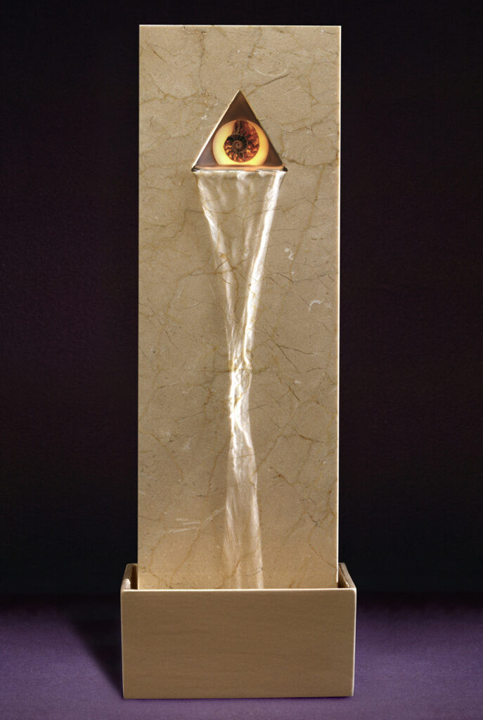 These are indoor fountains, illuminated from within, and made of ceramic, stone and stained glass. A gentle cascade of water adds a calming energy to any environment. Designed using principles of sacred geometry.
