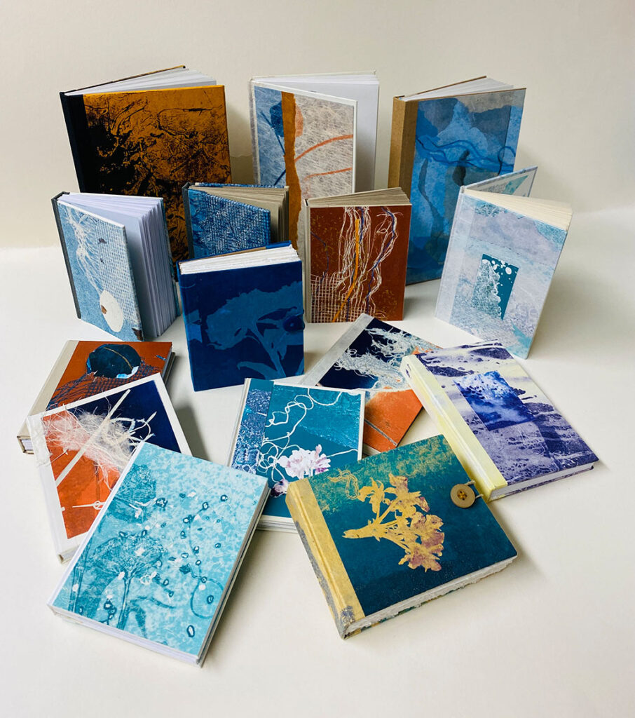 My entire home is a gallery where I display all my work. During the Studio Tour, visitors will have the opportunity to explore designated areas in my home and studio, where they can view my work. The art created in the studio consists of acrylic and mixed-media paintings on canvas, monotypes, and handmade journals made from repurposed materials available in the studio. The journals I make, mainly using repurposed and scrap materials, will be available in sizes ranging from 6” x 4” to 9” x 5.5”. There will also be several bins with unframed acrylic and monotypes, along with original notecards.